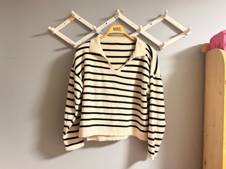Siyah-krem çizgili, yakalı, uzun kollu örgü kadın kazak. Yün malzemeden, rahat kesim ve günlük sokak stili için uygundur. V yaka. Flaşla ve normal çekim fotoğrafları bulunmaktadır. S-M beden.Markasını hatırlamıyorum.