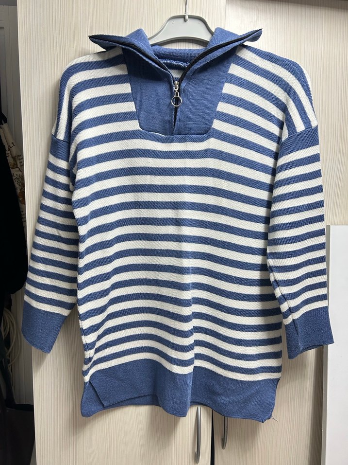 Yarım fermuarlı yüksek yakalı, uzun kollu, mavi-gri çizgili rahat kesim kadın triko sweatshirt.