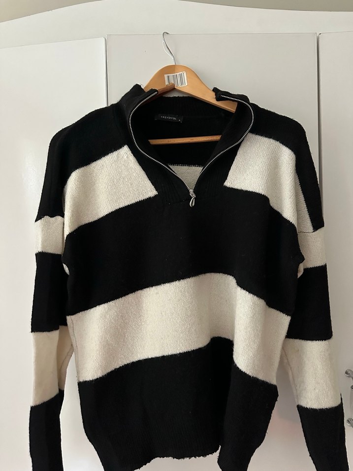 Yarım fermuarlı, uzun kollu, yüksek yakalı, yün örme kadın kazak. Siyah-beyaz çizgili, bol kesimli, rahat sokak tarzı kazak.