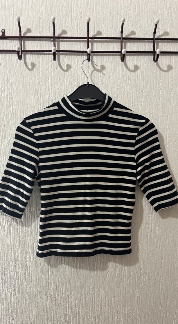 Kadınlar için çizgili, balıkçı yakalı ve yarım kollu crop top. Sentetik kumaştan örülmüş, siyah renkte, günlük kullanıma uygun, şık ve rahat.