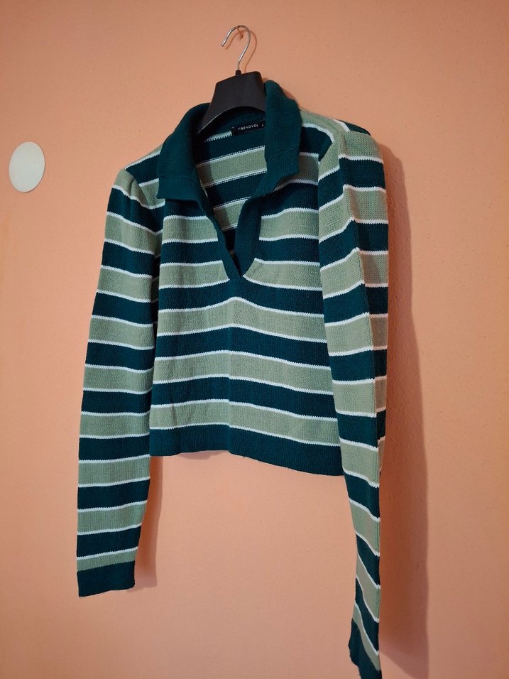 Uzun kollu, yakalı ve bol kesim kadın triko kazak. Yeşil ve gri çizgili, rahat sokak stili ve günlük kullanım için uygundur. trendyol kalın s beden az giyildi