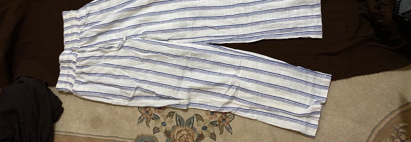 Mavi çizgili beyaz keten kadın pantolon, uzun boy ve yan yırtmaçlıdır. Rahat kesimi ve bohem tarzıyla günlük kullanıma uygundur.