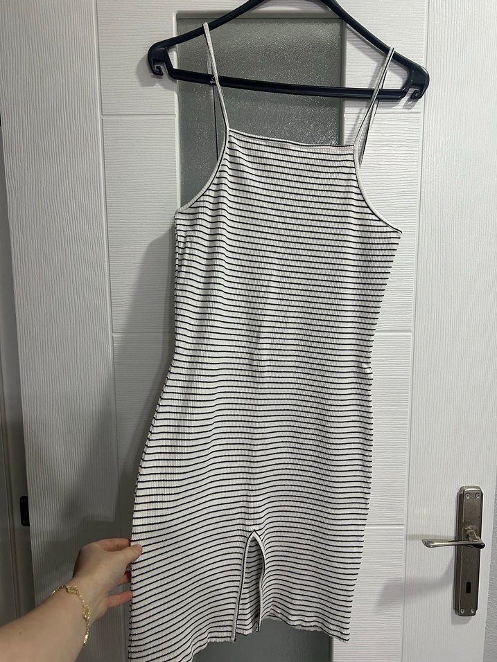 İnce askılı, yüksek yakalı ve ön yırtmaçlı, çizgili desenli, sentetik kumaştan yapılmış, gri tonlarda, dar kesim midi elbise. Bir kere giyildi