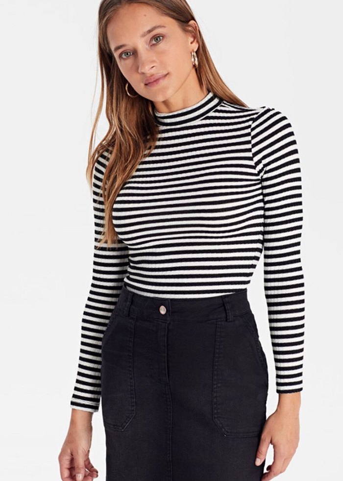 Yüksek yakalı, uzun kollu ve vücuda oturan bu kadın kazak, kot görünümlü kumaştan yapılmış siyah ve gri çizgili desene sahiptir. Günlük kullanıma uygun, sokak tarzı şıklığı sunar.