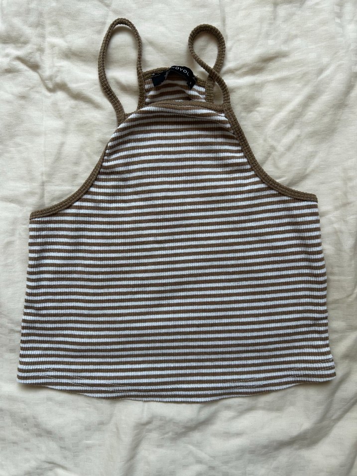 Yüksek yakalı, kolsuz, çizgili ve bej-gri renklerde, tokalı detaylı kadın atlet. Yumuşak sentetik kumaştan, günlük rahat stil için uygundur.