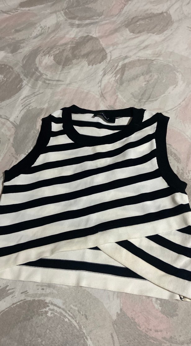 Kadınlar için kolsuz, yüksek yakalı, normal boyda ve ince kesim çizgili bir crop. Örgü sentetik kumaştan üretilmiştir ve gündelik spor şıklığı için uygundur.