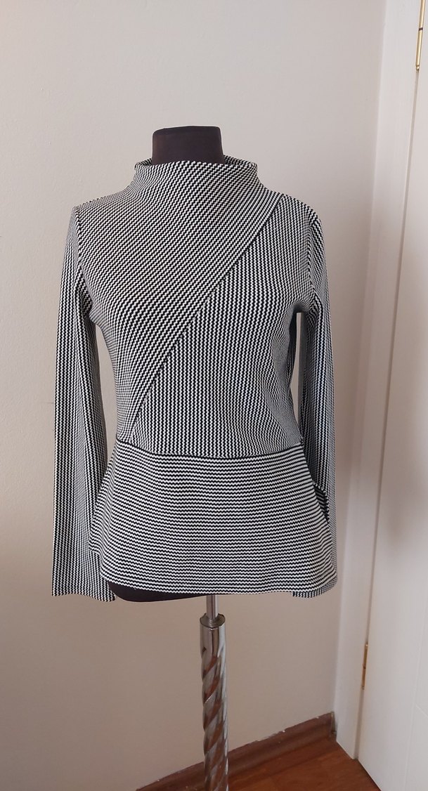 sentetik kumaştan, çizgili yüksek yakalı, uzun kollu, normal im kadın kazak. Ofis için uygun.