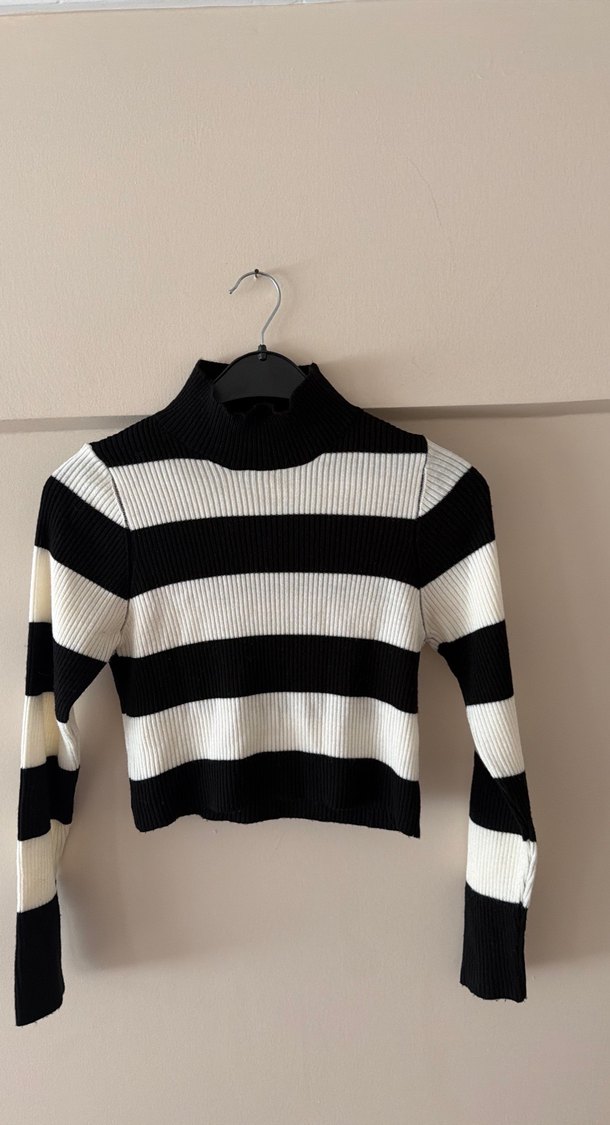 Yüksek yakalı, uzun kollu, siyah beyaz çizgili triko. İnce ve vücuda oturan kesimiyle günlük sokak stiline uygundur.