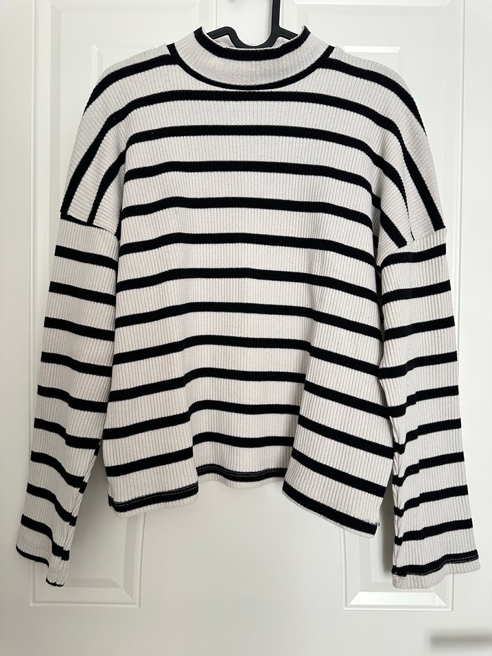 Kadınlar için yüksek yakalı, uzun kollu ve bol kesim bir triko kazak. Pamuklu, çizgili ve örgü dokulu, gündelik kullanıma uygun midi boyda.