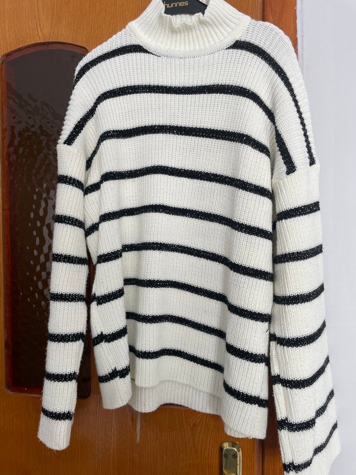 Yüksek yakalı, uzun kollu, çizgili beyaz ve gri triko kazak, rahat kesimiyle günlük sokak stiline uygundur.