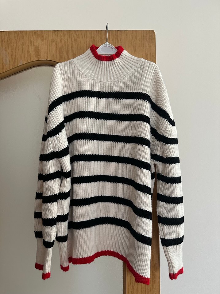 Yüksek yakalı, uzun kollu ve bol kesim olan bu triko kazak, beyaz zemin üzerine siyah çizgiler ve kırmızı detaylar içerir. Günlük kullanıma uygundur.