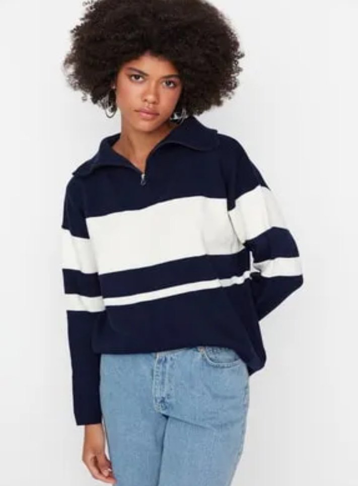 Mavi beyaz çizgili, yüksek yakalı ve uzun kollu, bol kesim kadın sweatshirt. Denim kumaştan, günlük kullanıma uygun rahat bir model.