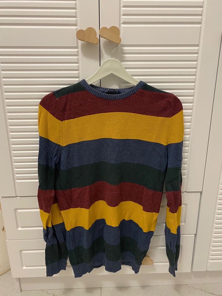 Uzun kollu, yuvarlak yakalı, gevşek kesim kadın yün kazak. Çok renkli koyu çizgili ve normal midi boyda, günlük rahat sokak stili için uygundur.