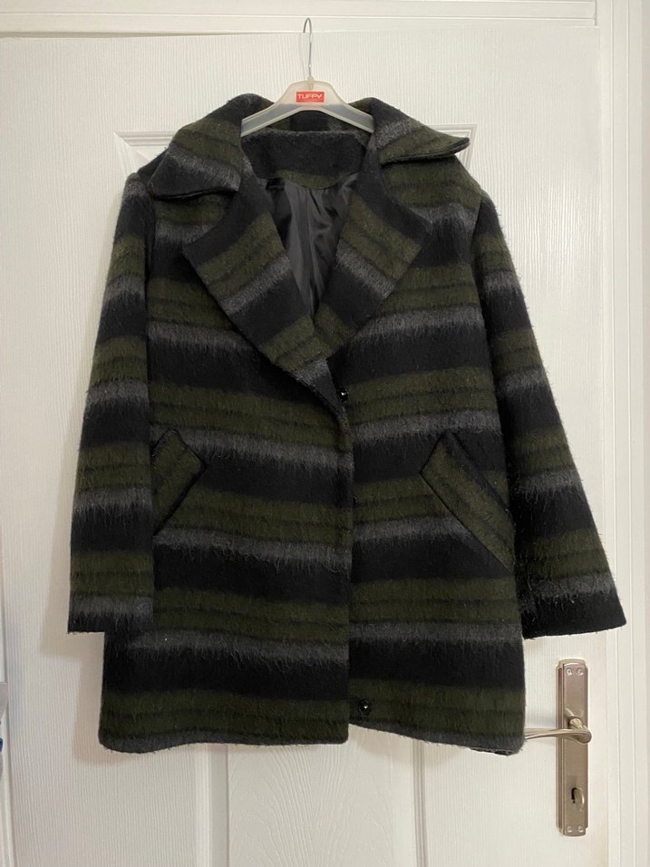 Çizgili Yünlü Astarlı Gri yeşil Midi Kaban