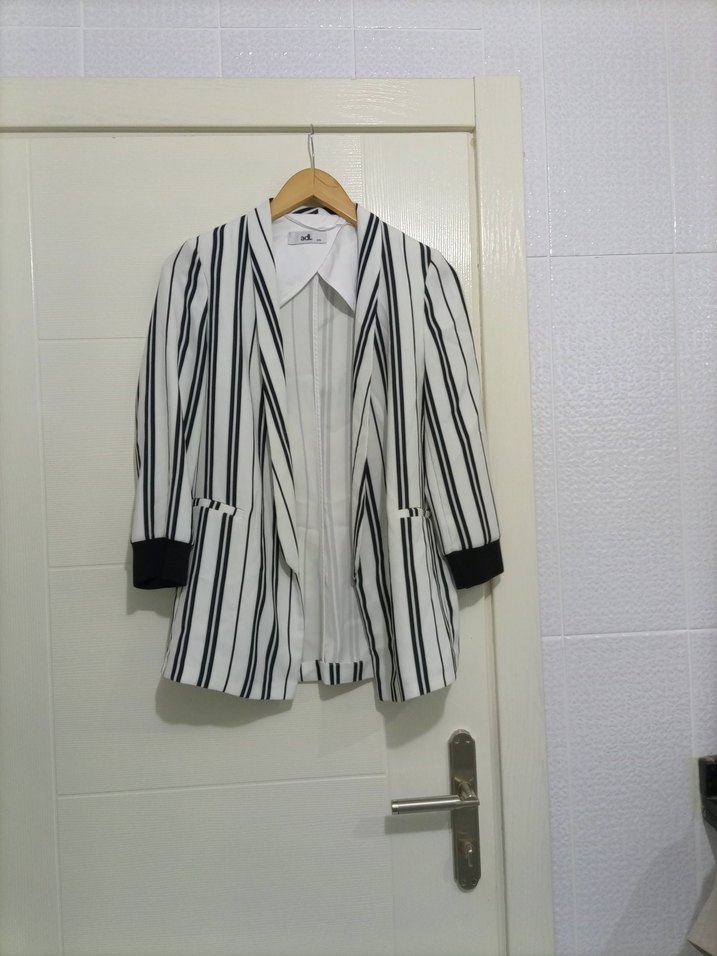 Bu beyaz kadın blazer ceket,cuzgili desenli, ve kesik yaka sahiptir. Uzun kollu, midi boy ve normal kesimdir, ofis ya da günlük kullanım için uygundur. S bedende kullandim