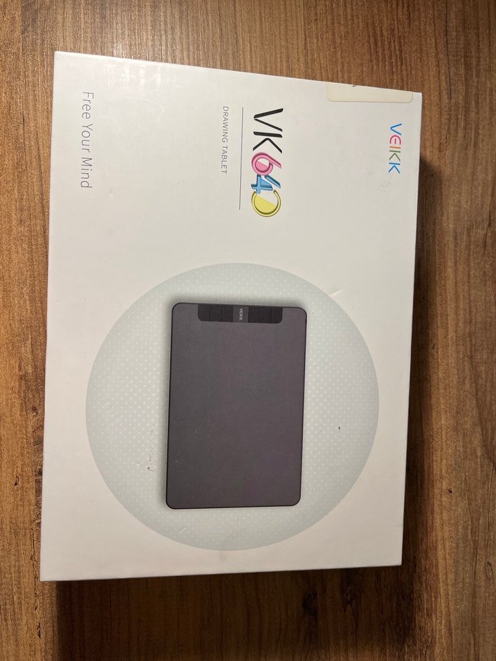 VEIKK VK640 çizim tableti koyu gri renkte, kompakt tasarıma sahip. AIYINGTABLE teknolojisi ve 'Free Your Mind' sloganı içerir.