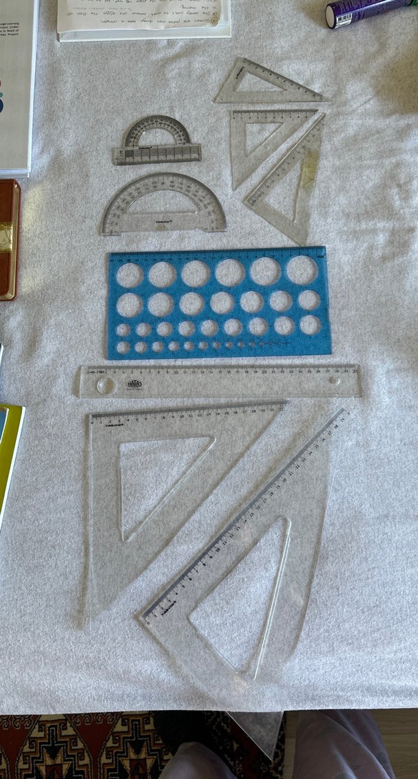 Mühendislik ve mimarlık öğrencileri için: Şeffaf cetveller, açıölçerler ve farklı boyutlarda daireler içeren mavi şablonlu çizim ve ölçüm seti.