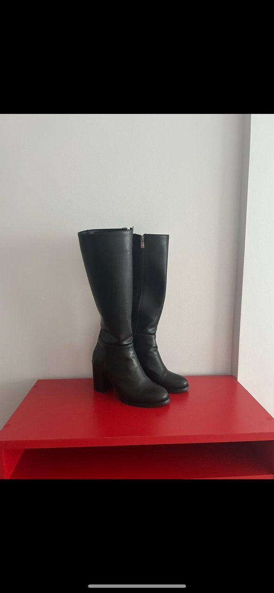 Tokalı detaylı, blok topuklu siyah deri dizüstü kadın çizme. Minimalist goth tarzıyla cesur günlük kullanım için uygundur. 37 numara sadece 2 kez giyilmis çizme, topuk boyu 5 cm