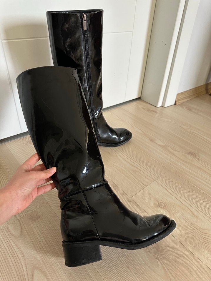 Parlak siyah rugan görünümlü, dizüstü, stiletto topuklu kadın çizme. Düz ve desen içermeyen tasarıma sahip, yan fermuarlı.