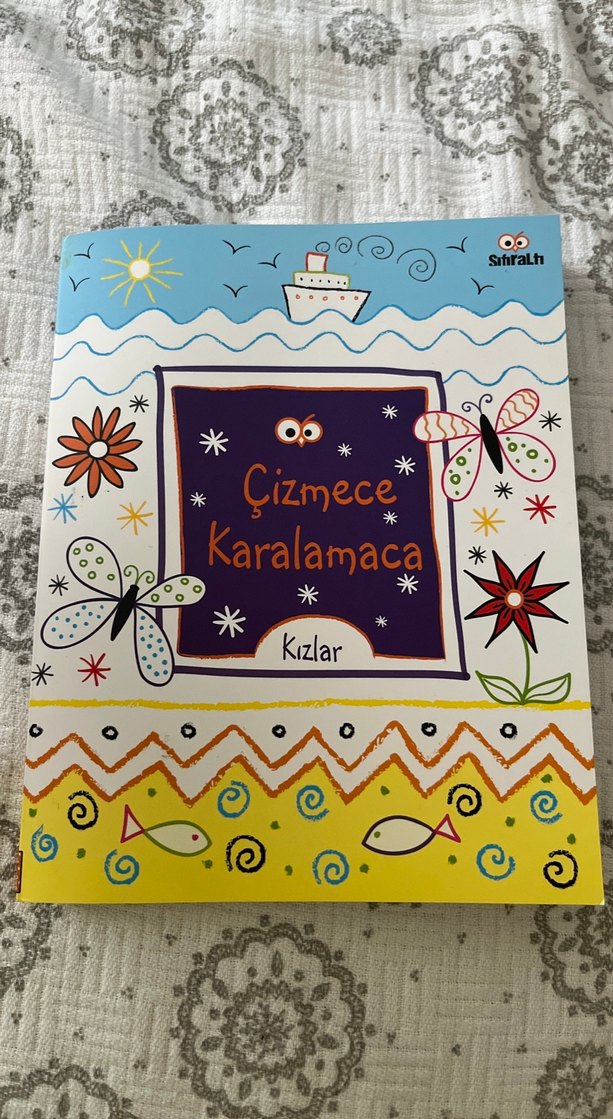 Çiçekler, balıklar ve kelebekler ile dolu renkli 'Çizmece Karalamaca Kızlar' çocuk kitabı.