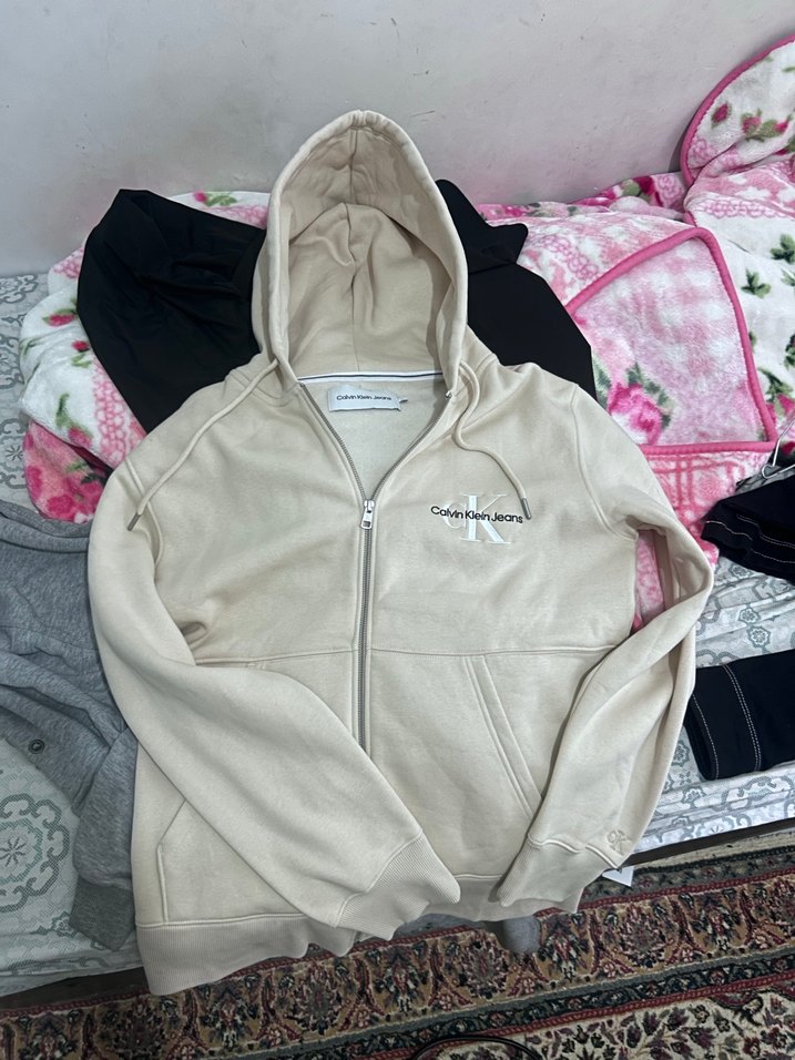 Yumuşak kumaştan yapılmış, kapüşonlu, fermuarlı, uzun kollu ve vücuda oturan bej kadın sweatshirt. Günlük ve sokak stiline uygun.