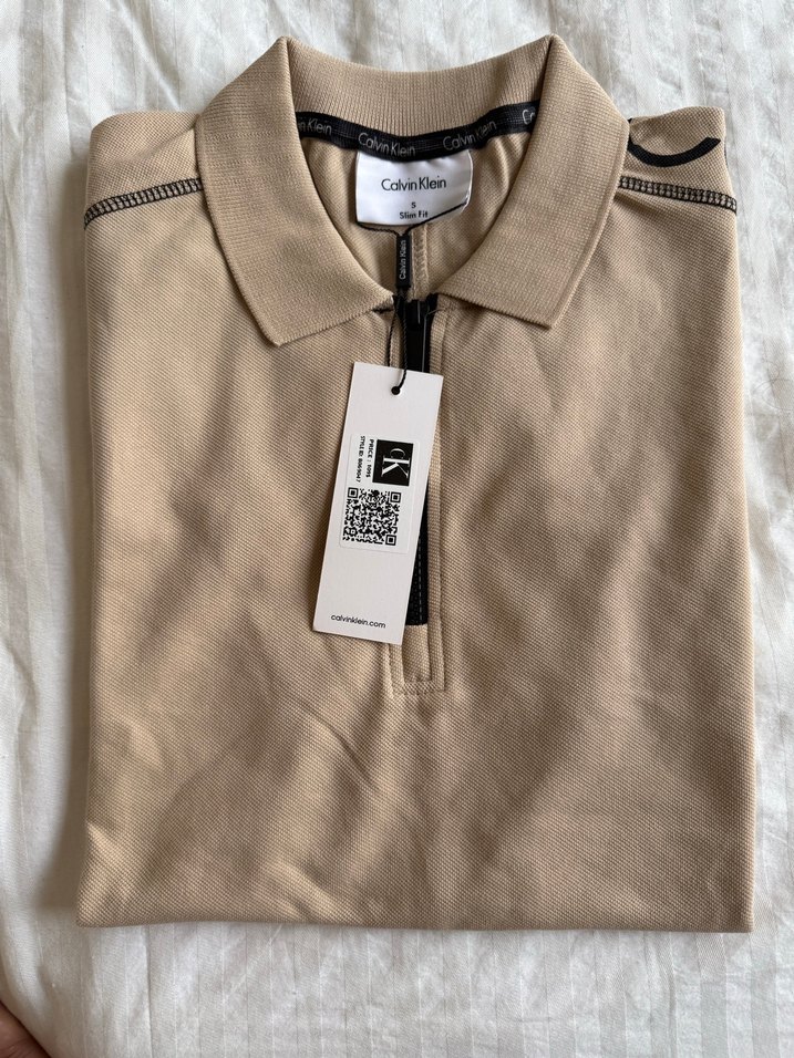 Calvin Klein %100 pamuklu ORJİNAL etiketli Bej renkli, fermuarlı önden kısa kollu, yakalı erkek polo tişört baskılı desenli, normal kesim ve günlük rahatlık sağlar.