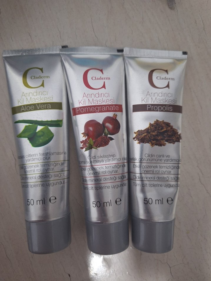 Claderm arındırıcı kil maskeleri 50ml tüplerde; Aloe Vera, Nar ve Propolis çeşitleri ile cildi temizlemeye ve canlandırmaya destek olur.