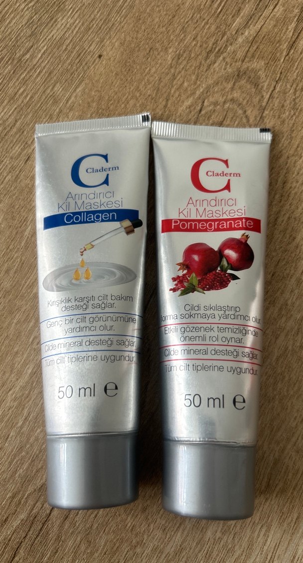 Claderm'in 50ml'lik arındırıcı kil maskeleri, nar ve kolajen içerir. Tüm cilt tiplerine uygun, gözenek temizliği ve cilt sıkılaştırmada etkilidir.