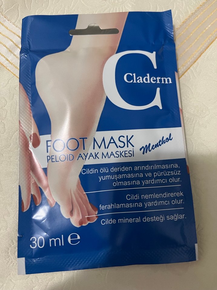 Claderm mentollü ayak maskesi, ölü deriyi arındırır, cildi yumuşatır ve pürüzsüzleştirir. Cildi nemlendirir, ferahlatır ve mineral desteği sağlar. 30 ml. 2 adettir