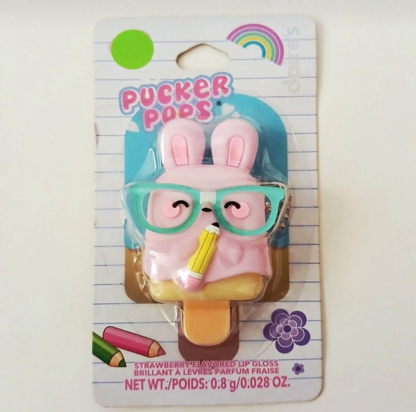 Pastel pembe tavşan şeklinde, gözlüklü ve kalem desenli çilek aromalı dudak parlatıcısı. Net ağırlık 0,8g.