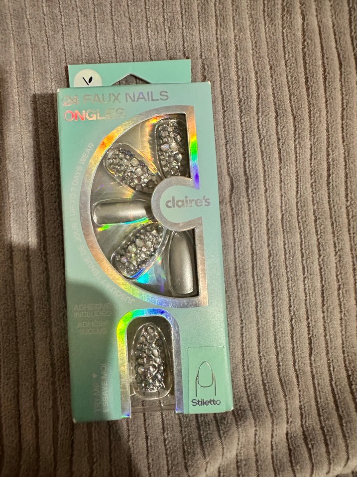 Claire's gri stiletto takma tırnaklar, taş detaylarıyla şık bir görünüm sağlar. Kolay uygulanır ve çıkarılır. Hiç kullanılmadı içerisinde yapıştırıcı mevcut