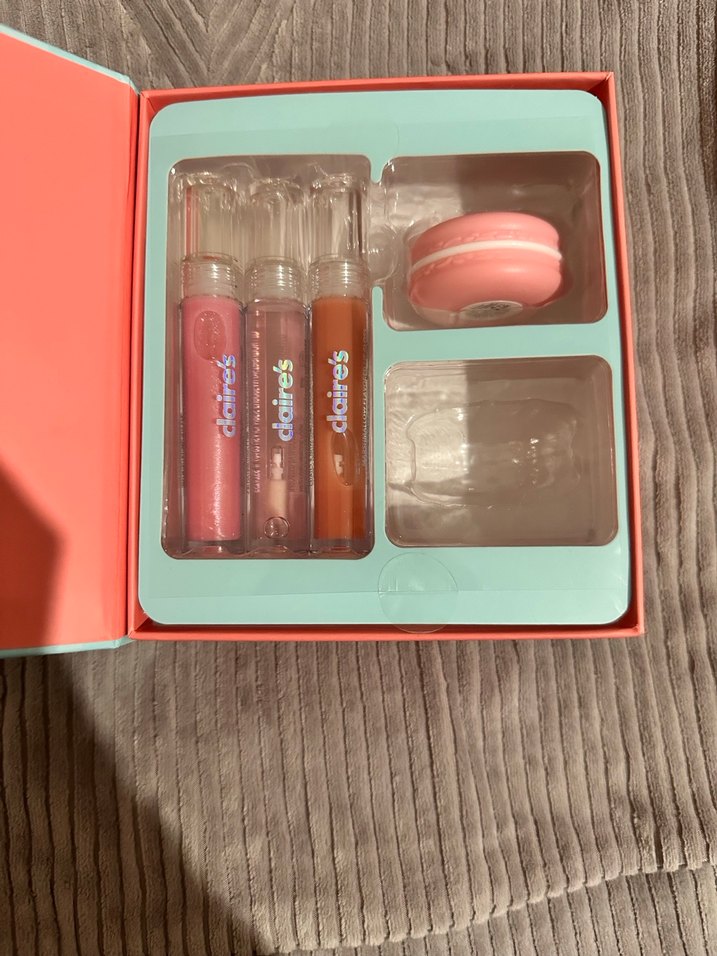 Claire's dudak parlatıcı seti, üç pastel pembe ton ve küçük yuvarlak bir kutu içerir, dudaklar için parlak ve yumuşak bir görünüm sağlar.