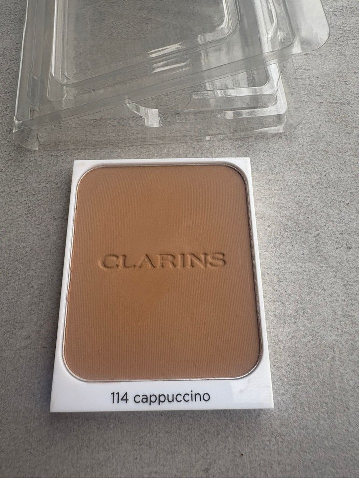 Clarins 114 Cappuccino parlak bej renkte, doğal görünümlü pürüzsüz kapatıcılık sağlayan pudra.