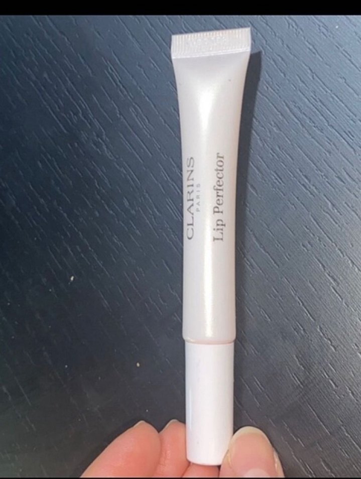 Clarins Lip Perfector, beyaz şık tüpte, doğal parlaklık için hafif ton sağlar.