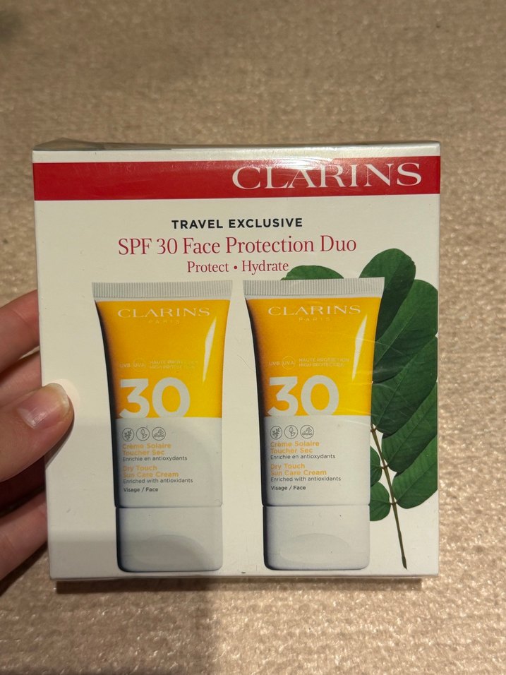 Clarins Travel Exclusive SPF 30 Yüz Koruma Seti, antioksidan içeren formülleriyle güneş koruması ve nemlendirme sağlar. Orijinaldir. Hiç açılmadı. #clarins #güneşkremi #kadın #travel #kozmetik
