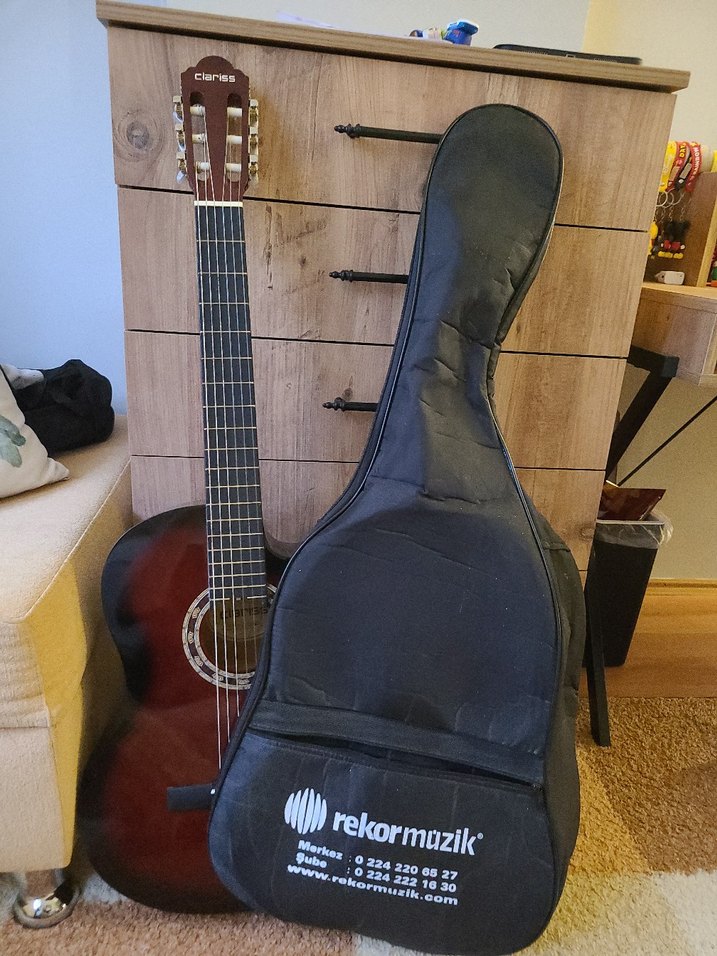 Kahverengi klasik gitar ve üzerinde 'rekormuzik' yazılı yumuşak taşıma kılıfı. Nylon teller ve ahşap gövdeye sahip. ürün az kullanılmıstır 2 3 teli paslidir fotograftaki disinda hic bir sorunu cizigi yoktur yaninda 1 tel hediyedir