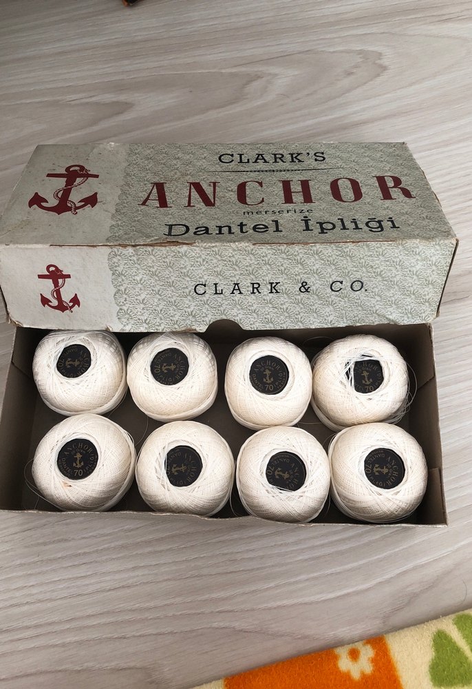 Clark's Anchor markalı, orijinal kutusunda sekiz adet beyaz dantel ipliği seti. Vintage tarzda, ince dantel işlerinde kullanılabilir.