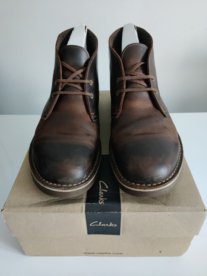 Modeli aslen Clarks Bushacre 2 diye geçiyor ama daha popüler olduğu için Desert Boot yazdım. Temelde ikisi de aynı aslında, bu modelin tabanı Desert Boot gibi kauçuk değil sadece. Temizlik ve sağlamlık açısından bu taban daha iyi oluyor. İki sezon giydim ancak nadiren ve titiz bir şekilde kullanıldı. Belli oluyordur diye düşünüyorum, fotoğraflarda göründüğünden daha iyi durumda hatta. Numarası etikette 43 fakat kalıbı büyük. Benim ayağım normalde 44 ve tam oluyor bana.