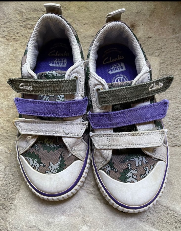 Yurtdışından geçen yaz alındı, Clarks marka yazlık dinazor desenli bez ayakkabı, kullanıma bağlı yıpranma var ancak yırtık, delik vb. bulunmuyor. Yıpranma üst cırtcırtlarda, kullanıma engel değil, görsel açıdan yıpranma, fotoğrafta da detaylı görülebilir. Makinede yıkanabilir, iç tabanlık çıkıyor ve elde yıkanabiliyor. Kutusu bulunmuyor.