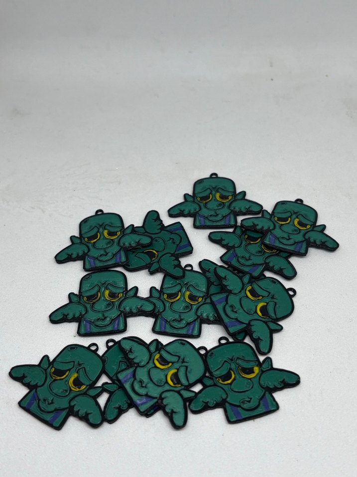İfade dolu yüzlere sahip koyu yeşil animasyon figürleri, küçük koleksiyonluk aksesuar olarak tasarlanmıştır.