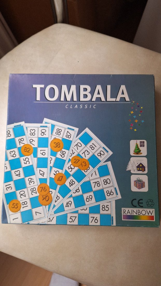 Tombala Classic kutusunda numaralı kartlar ve işaretleyiciler bulunur. Mavi kutulu, grup oyunları için uygundur.
