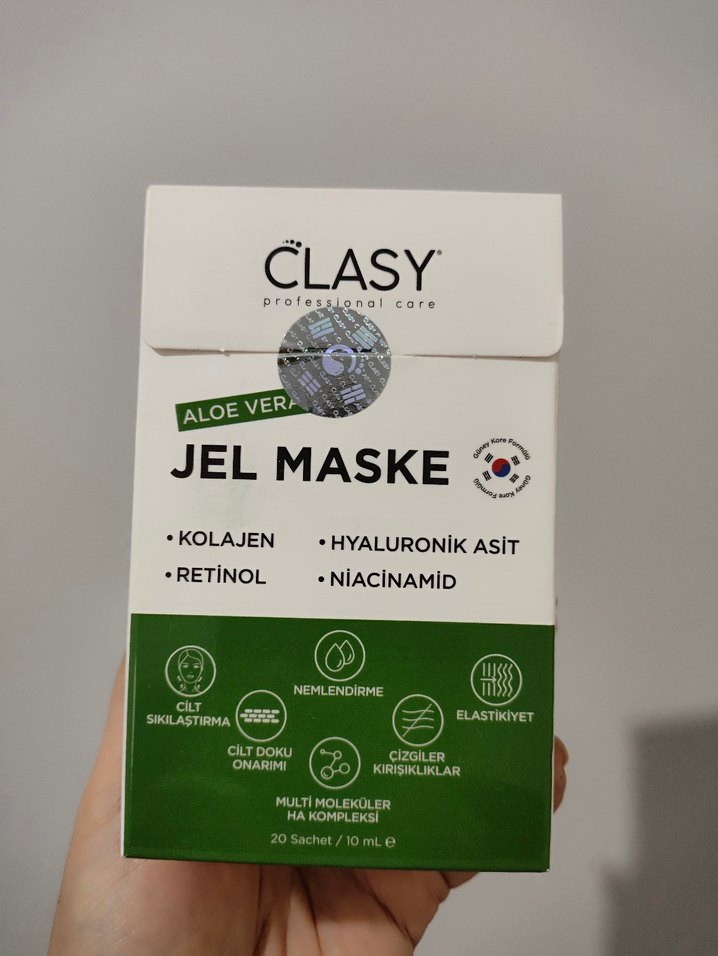 Clasy Aloe Vera Jel Maske, kolajen, retinol, hyaluronik asit ve niacinamide içerir. Tüm cilt tipleri için nemlendirici ve gençleştirici etki sağlar.
