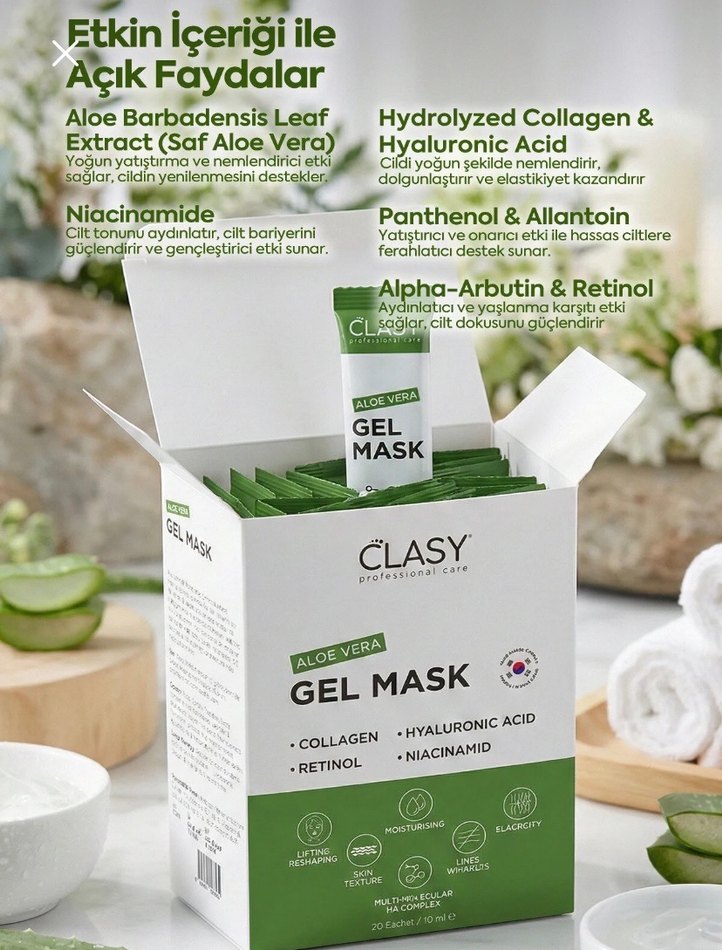 Clasy Aloe Vera Jel Maske, kolajen, hyaluronik asit, niasinamid ve retinol içerir. Cildi nemlendirir, esnekliğini destekler ve cilt bariyerini güçlendirir.