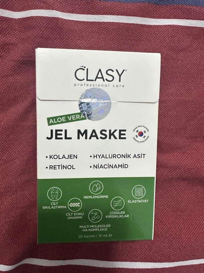 Clasy Aloe Vera jel maske; kolajen, hyaluronik asit, retinol ve niasinamid içerir. Cilt sıkılaştırma, nemlendirme, elastikiyet ve kırışıklıklar için destek sağlar. 20 adet 10 ml'lik paketler halinde.