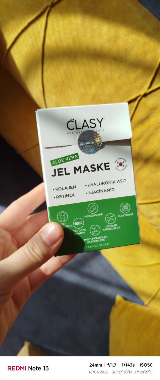 Clasy Aloe Vera jel maske, kolajen, retinol, hyaluronik asit ve niacinamid içerir. Cildi nemlendirir, dokusunu iyileştirir ve elastikiyetini artırır. Kırışıklıkları azaltır ve cildi canlandırır.