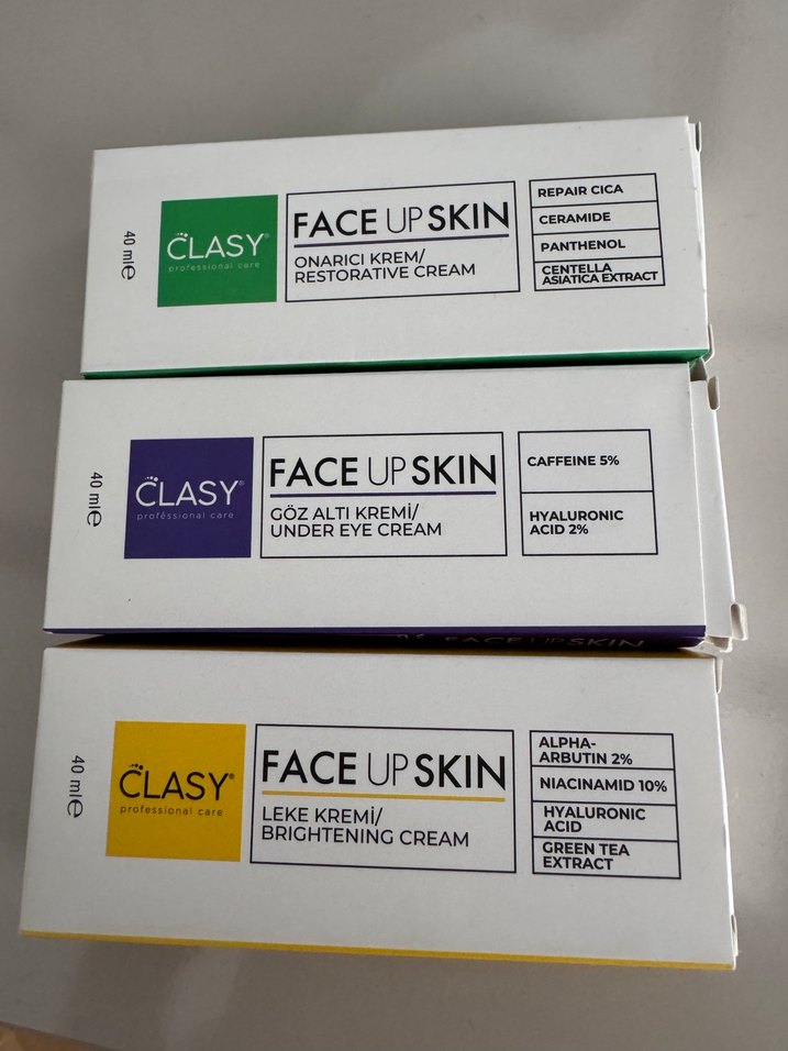 Clasy Face Up Skin seti; seramid ve pantenol içeren onarıcı krem, kafein ve hyaluronik asit içeren göz altı kremi, alfa-arbutin ve niasinamid içeren leke kremi içerir. ✨