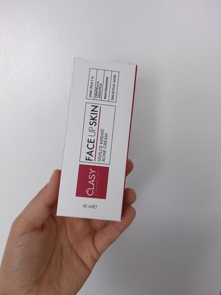 Clasy Face Up Skin sivilce kremi, cildi yenileyen ve sivilceleri azaltan salisilik asit içerir. 40 ml tüpte.