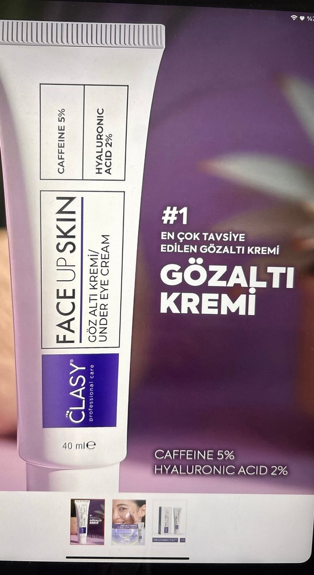 Clasy gözaltı kremi, %5 kafein ve %2 hyaluronik asit içerir. 40 ml tüp, göz çevresini nemlendirir ve canlandırır.