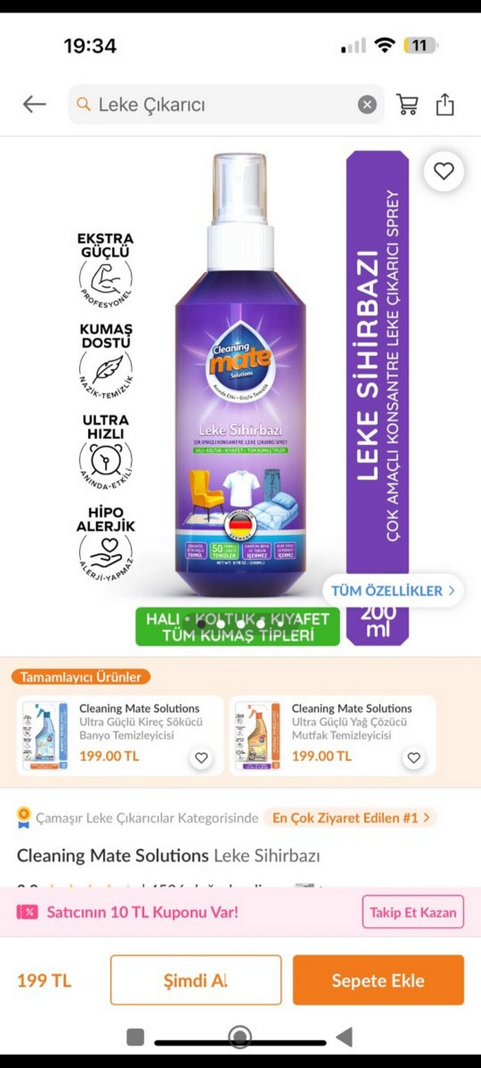 Cleaning Mate Solutions Leke Sihirbazı, tüm kumaş tipleri için ekstra güçlü, kumaş dostu, ultra hızlı ve hipoalerjik konsantre leke çıkarıcı sprey. Halı, koltuk ve kıyafetlerde kullanılır.