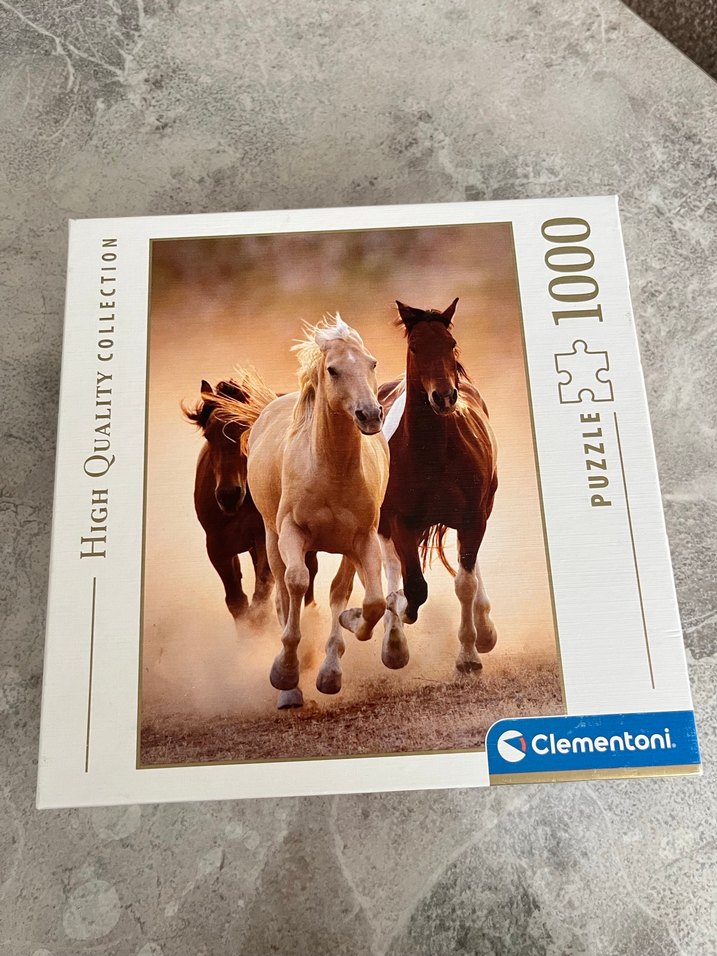 (Eksik parça yoktur. Bir kere yapıldı.) Clementoni'nun 1000 parçalık, açık camel tonlarında koşan atlar temalı yüksek kaliteli puzzle seti.